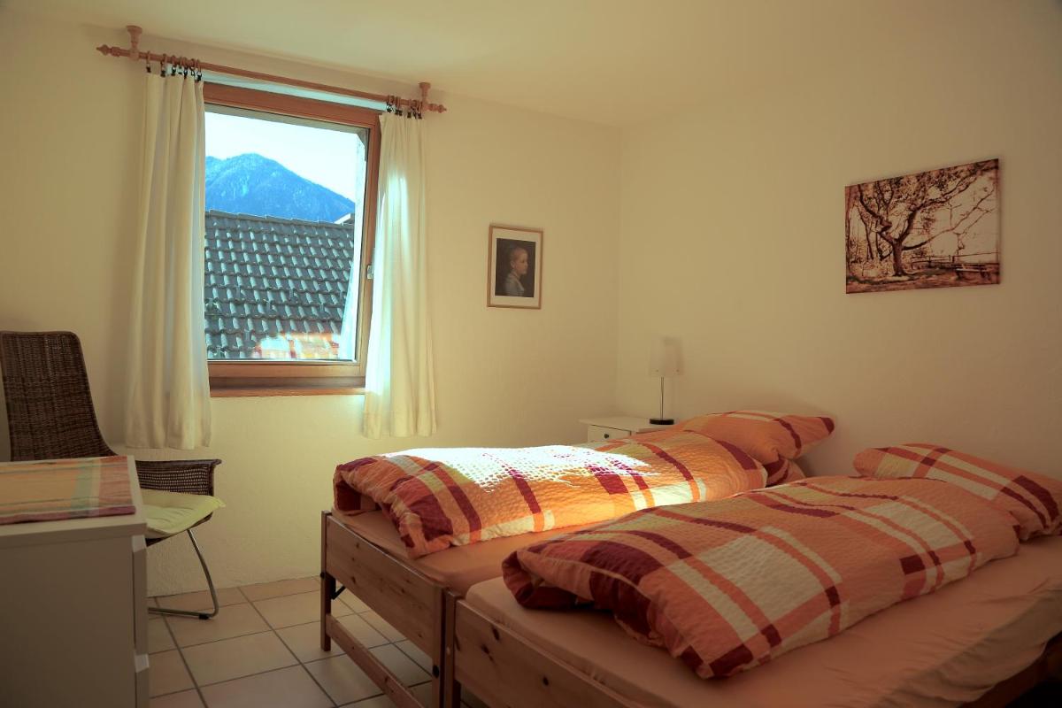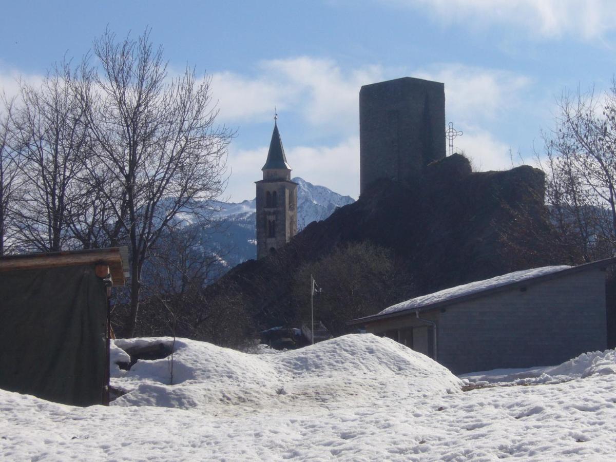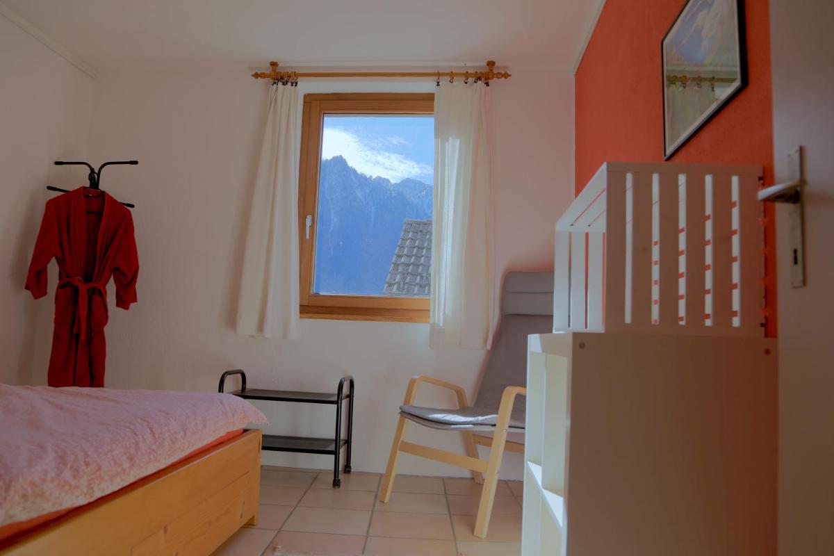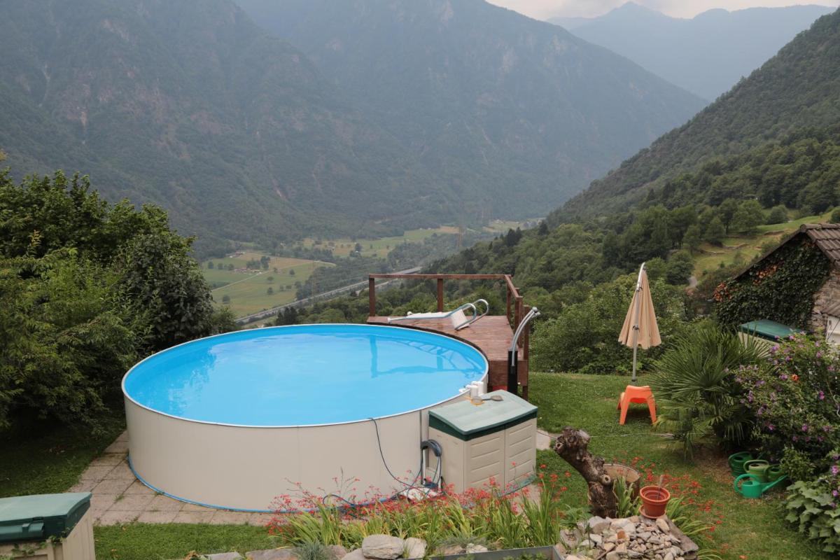 Exterior images showcase the surrounding alpine environment, including nearby hills and open sky. Outdoor areas such as garden or terrace space appear as extensions of the living area, designed for relaxation during warmer months.